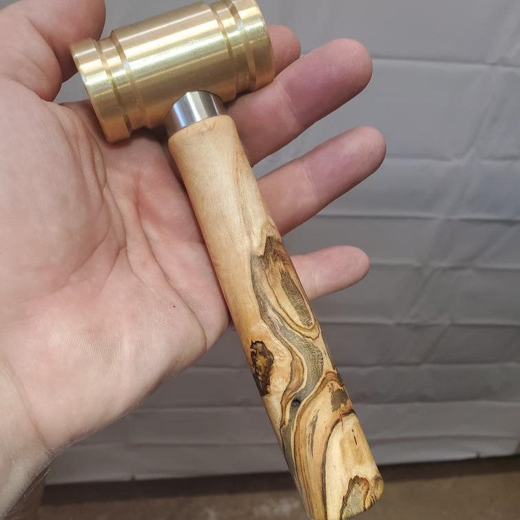 The Large Brass Hammer Kit is a premium kit made in Honesdale, PA. Each kit comes with (1) Large Brass Head, (1) Stainless Steel Ferrule, (1) Stainless Set-screw, and (1) of our Brass Inserts. The Brass head is 1.25″ dia x 2.25″ long. It weighs in at 12oz. This weight is before set screw, insert, ferrule, and handle. The Stainless Ferrule is for added strength. It has a 13/16″ OD x 3/4″ ID x 3/8″ long. The stainless set-screw is 3/8″-16 x 2″ long.