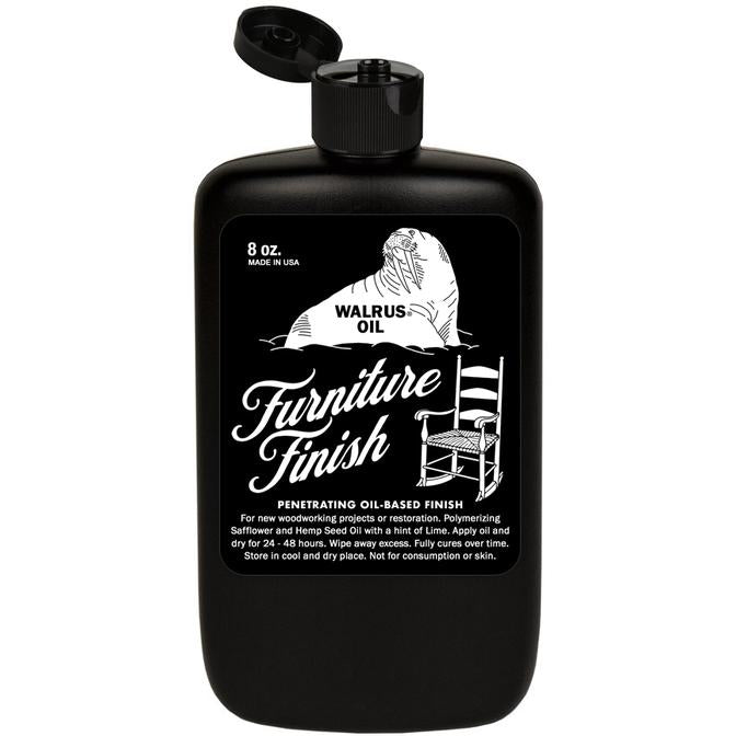 Walrus Oil's Furniture Finish is a penetrating oil-based finish that soaks deep into hardwoods, pulling out natural wood colors and tones, and locking them in permanently. There are no dyes or added dryers, which can cause yellowing in the wood. Furniture Finish is completely natural, vegan friendly, and made of Polymerizing Safflower Oil, Hemp Seed Oil, Tung Oil, Perilla Seed Oil, and a hint of Lime for freshness. Ideal for hardwood chairs, dressers, picture frames and more. Safe for food-contact surfaces. Cures to a beautifully smooth matte finish.