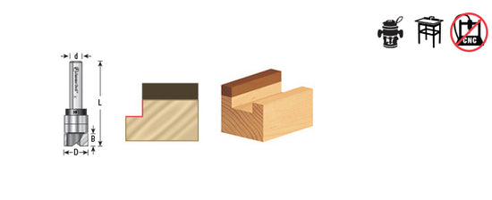 This bit is essentially a plunge-cutting straight with a shank-mounted ball-bearing pilot. Versatile, useful for template/pattern routing of parts, joints, internal cuts and can be used in handheld and table-mounted routers. The template is attached to the workpiece, and the pilot bearing rides along its edge as the cutting edges rout the workpiece, forming an exact duplicate of the template. With a handheld router, the pattern is on top of the work; with a table-mounted router, the pattern is underneath the work. Double Bearing.