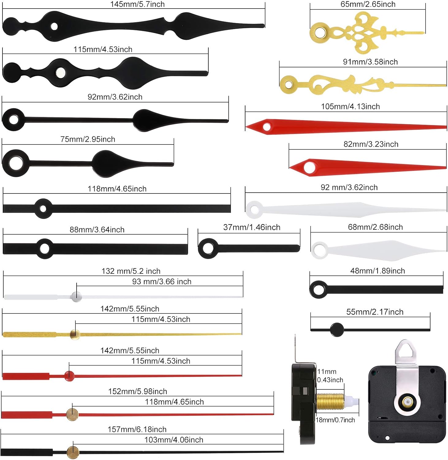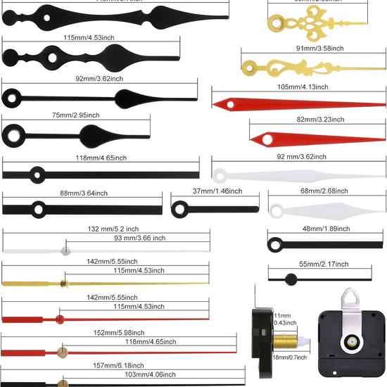 - Size information: the total length of the shaft is about 18 mm/ 0.7 inch, while the thread length measures approximately 11 mm/ 0.43 inch, which is suitable for clock panels with a thickness of 4 - 7 mm/ 0.16 - 0.28 inch, and the clock hands fit for a diameter of 25 - 35 cm clock surface, please check the size before installing with this clock accessories kit