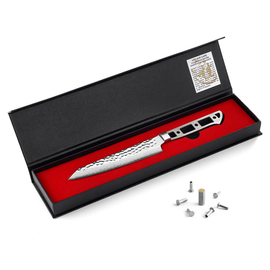 THE KNIFE OF A KITCHEN SAMURAI – Our culinary multi-task Petty knife has a razor-sharp edge and agile blade to make chopping, cutting and slicing much easier. Create your own ergonomic handle out of any material around the perfectly balanced 3 pin handle. Transform into a kitchen samurai with your new Japanese Petty Chef knife.