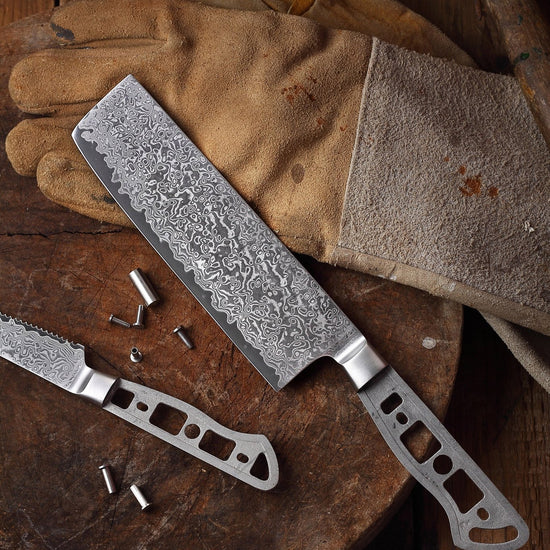 - KITCHEN KNIFE MAKING KIT – This woodworking project kit includes a full tang knife blank ONLY. Customize your very own knife handle by using wood, metal, Micarta, or even leather to create a cool accent. Give your Nakiri knife a unique personality by hand finishing all the parts. BONUS: Includes 3 sets of metal pins and a Mosaic center pin.