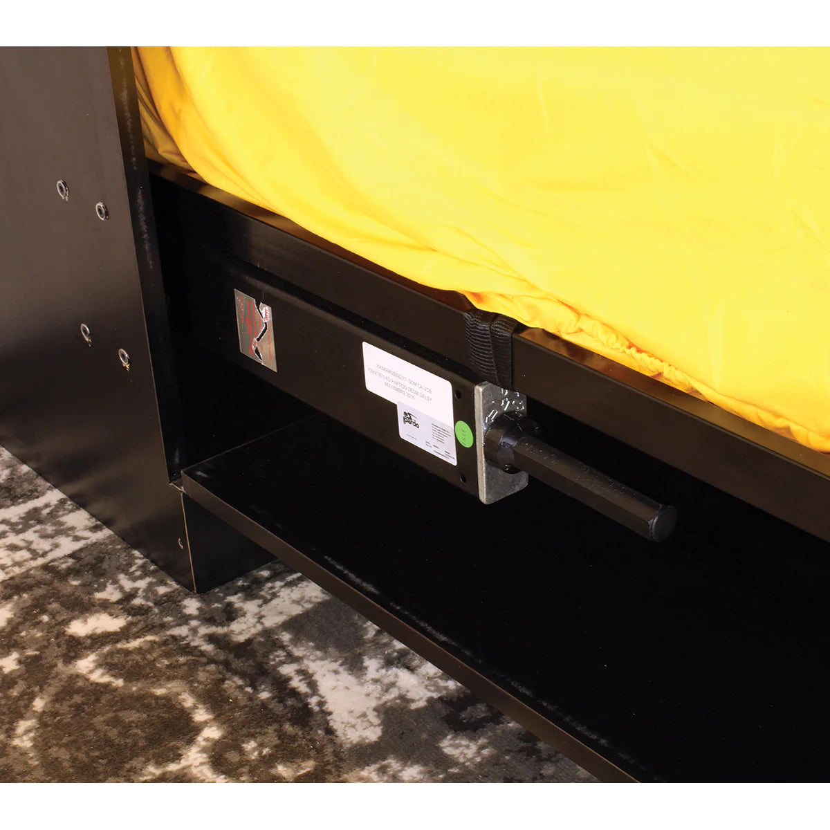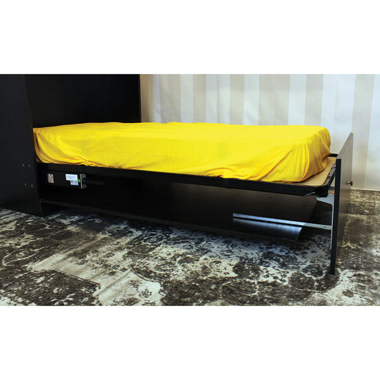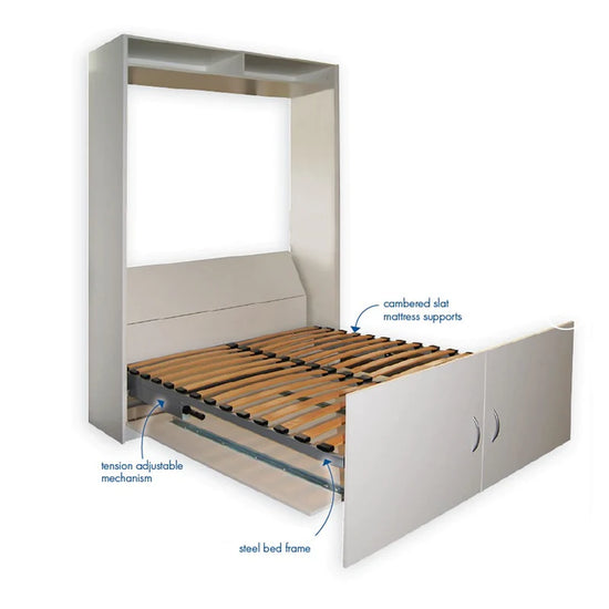 Counter-balanced mechanism mounts inside of cabinet, not fastened to the floor of the room. Tension adjustable according to mattress weight. Automatic Footboard opens itself as the bed is lowered. Featherweight-balanced. Easy tension adjustment, easy installation. Flexibility to use plywood panels or your own wooden slats as mattress support.