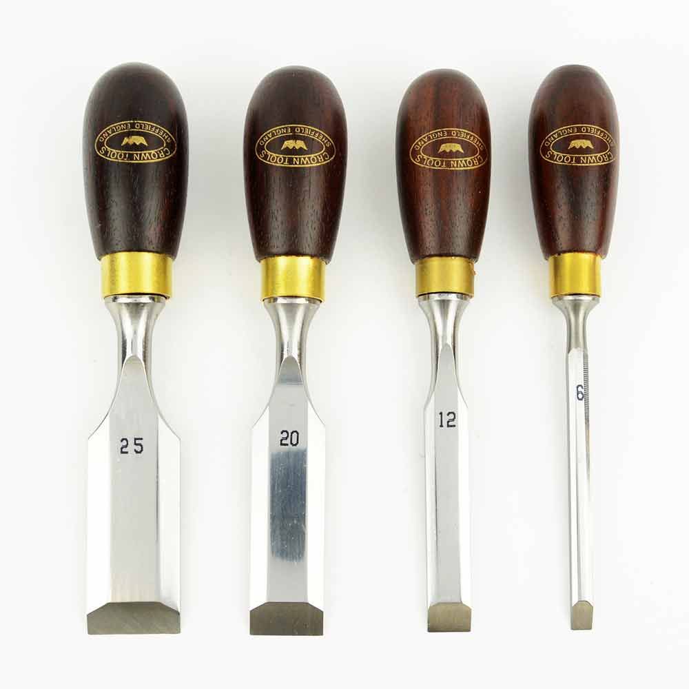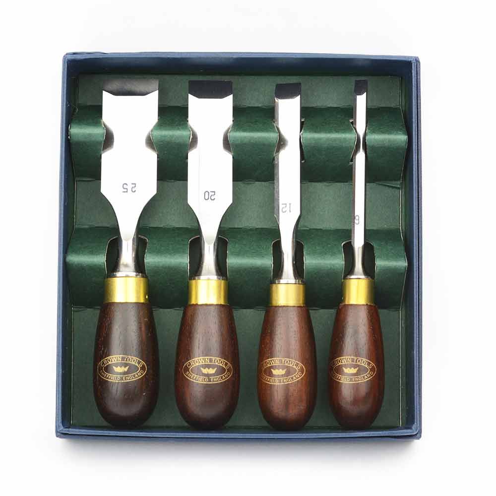 Crown Tools 174RB 4 piece boxed butt chisel set. These small, fine quality Crown Butt Chisels are ideal for very precise hand cutting and pairing of joints. The overall length of the chisel is 6-Inch 152mm, with a 3-1/2-Inch 89-mm blade and a 2-1/2-Inch 63-mm handle. Set of four include 1/4-Inch, 1/2-Inch, 3/4-Inch, and 1-Inch. Rosewood handles with brass ferrule. Packaged in attractive cardboard display box.