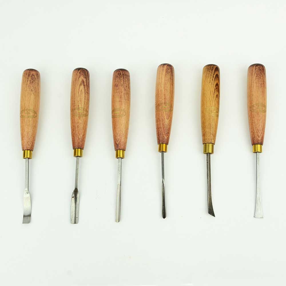 Crown Tools 220 6 Pc Boxed Woodcarving Tools. These carving tools are made from high quality hardened and tempered carbon steel and fitted with stained beech handles. The ready honed blades feature 5/16" square chisel, 5/16" bent square chisel, 5/16" skew chisel, 3/16" straight gouge, 5/16" bent gouge and 3/16" bent V tool.