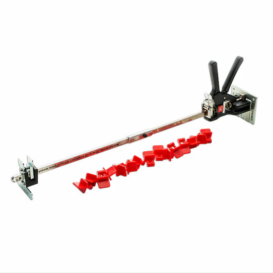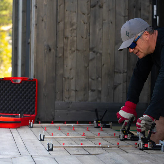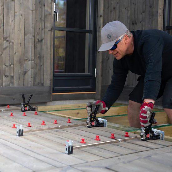 Use your Viking Arms to level, press, and squeeze the foundation into place. Pick up your Decking Kit and mount the shaft extenders and the clamp lock to your Viking Arm, and you are ready to speed up the decking. Press several boards in place at the same time. Straighten warped boards. Fasten them all before doing the next several rows.