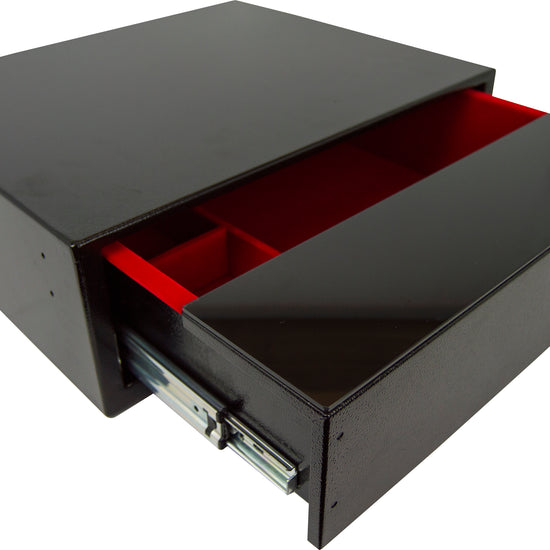 Drawer safe designed to fit in any cabinet or dresser drawer. It has an electronic touch pad lock along with a key.