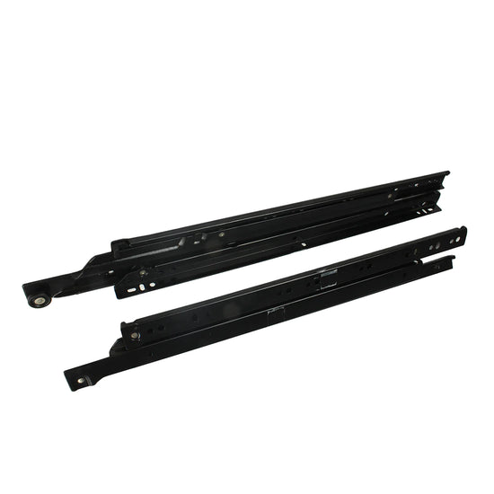 Heavier Steel (1.5mm), precision-stamped, and cleverly engineered. With both sides captive, eight Nylon rollers and Nylon-tracking glides provide a silky-smooth operation for loads up to 170 lbs.