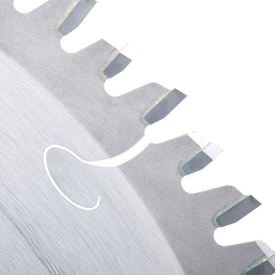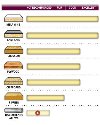 Designed for cutting double-sided melamine and veneered sheet goods on saws without a scoring unit. The H-ATB tooth geometry slices clearly through fragile coatings and laminates. The high bevel will not "violate" the bottom laminate upon exiting the cut, which causes "blow-out". Extra hard sub-micrograin carbide tips for long life.