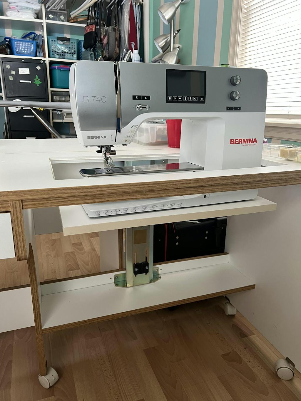 With it's simple design you can easily lower and raise your sewing machine in and out of your sewing cabinet with this sewing machine air lift.