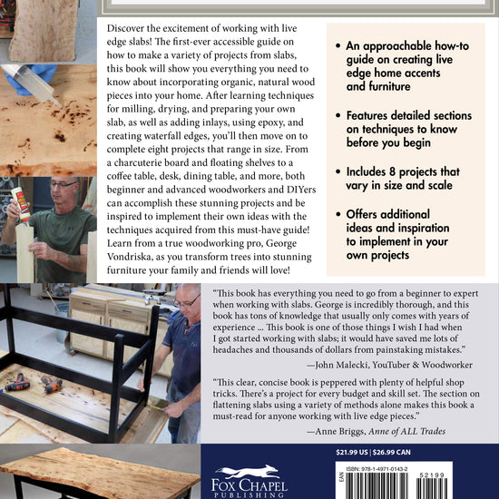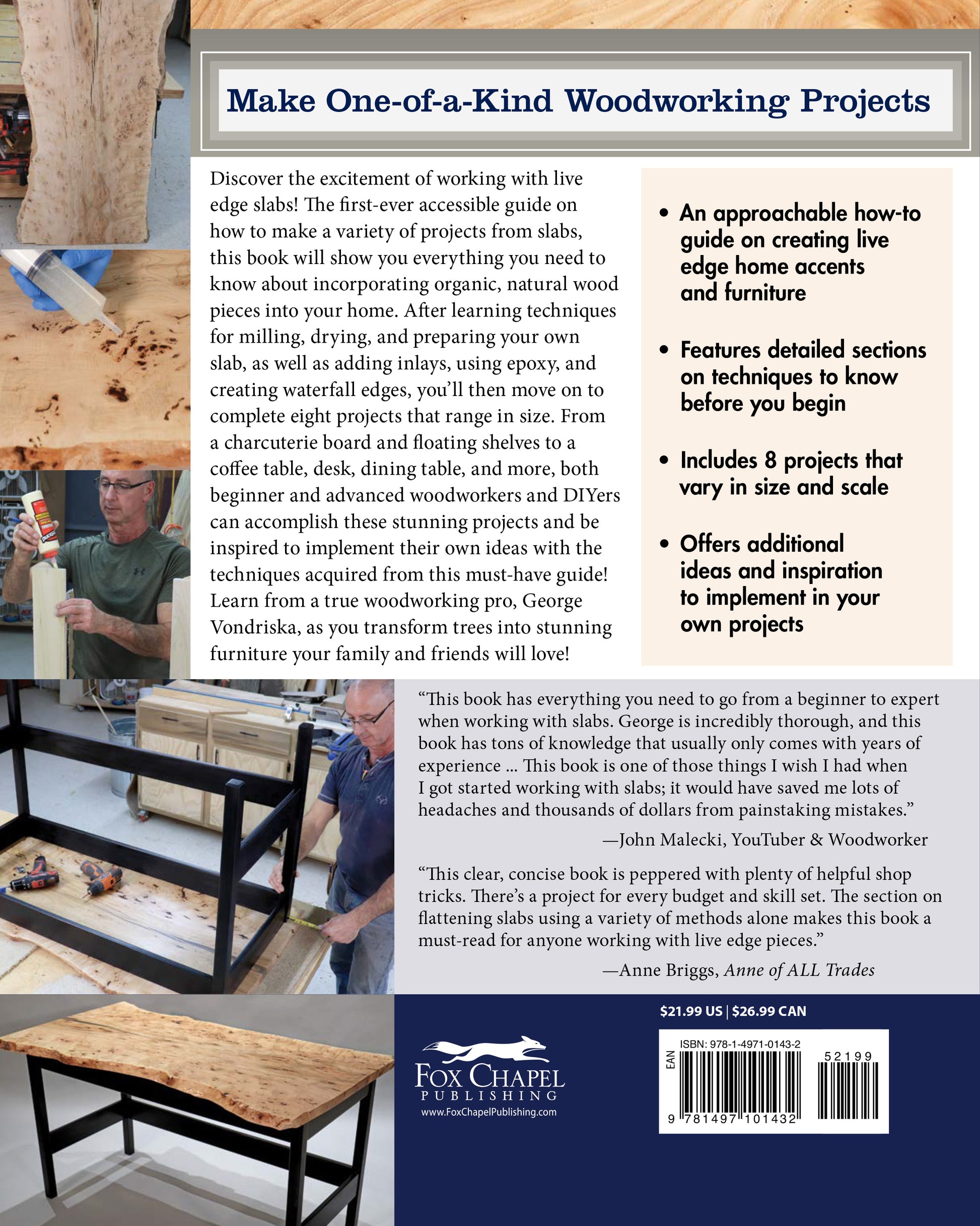 A complete and accessible guide on making DIY furniture from live-edge slabs, this book will show you everything you need to know about incorporating natural wood pieces into your home. After learning techniques for milling, drying, and preparing your own slab, adding inlays, using resin and epoxy, creating waterfall edges, and more, you’ll then move on to complete seven projects that range in size and offer additional ideas to implement in your own projects while using the techniques you’ve learned! From charcuterie boards and floating shelves to desks, dining tables, benches, and more, both beginner and advanced DIYers can accomplish these stunning woodworking projects!